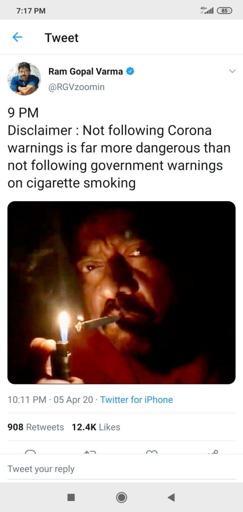 But the film maker RAM GOPAL VARMA wrote on his Twitter as….. Disclaimer : “Not following corona warning is more dangerous than not following government warnings on cigarette smoking”.
